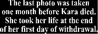 KARA LEFT THIS EARTH ON JUNE 7TH 2001 WHILE WITHDRAWING FROM PAXIL. SHE HAD BEEN TAKING PAXIL FOR 8 MONTHS WHILE WE CONTINOUSLY REQUESTED THE DOCTOR TO DISCONTINUE THE DRUG BECAUSE IT SEEMED AS THOUGH IT WAS DRAINING THE VERY LIFE RIGHT OUT OF HER.